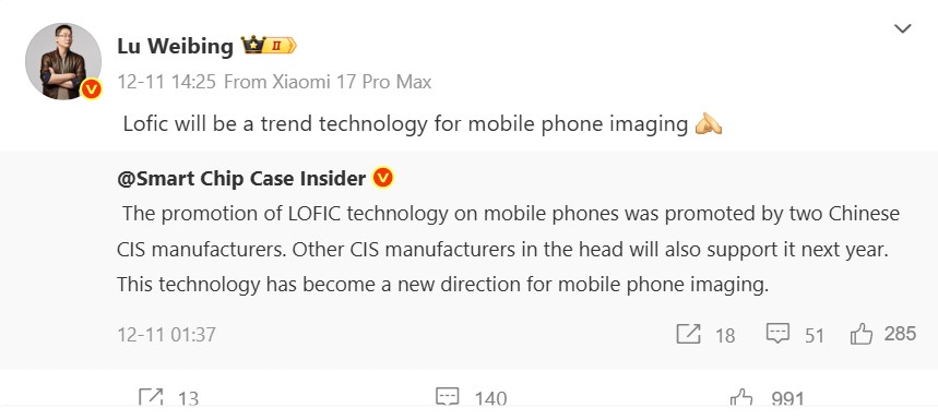 Em uma resposta em a um post no Weiboweibing enfatiza que a tecnologia "Lateral Overflow Integration Capacitor" se tornará uma tendência para as câmeras de smartphones, pois foi projetada para oferecer alta faixa dinâmica em uma única exposição e, ao mesmo tempo, evitar ruídos e cintilação do LED. A declaração do presidente da Xiaomi pode ser vista como uma confirmação de que o novo sensor Omnivision OV50X de 1 polegada do Xiaomi 17 Ultra utiliza a Lofic.