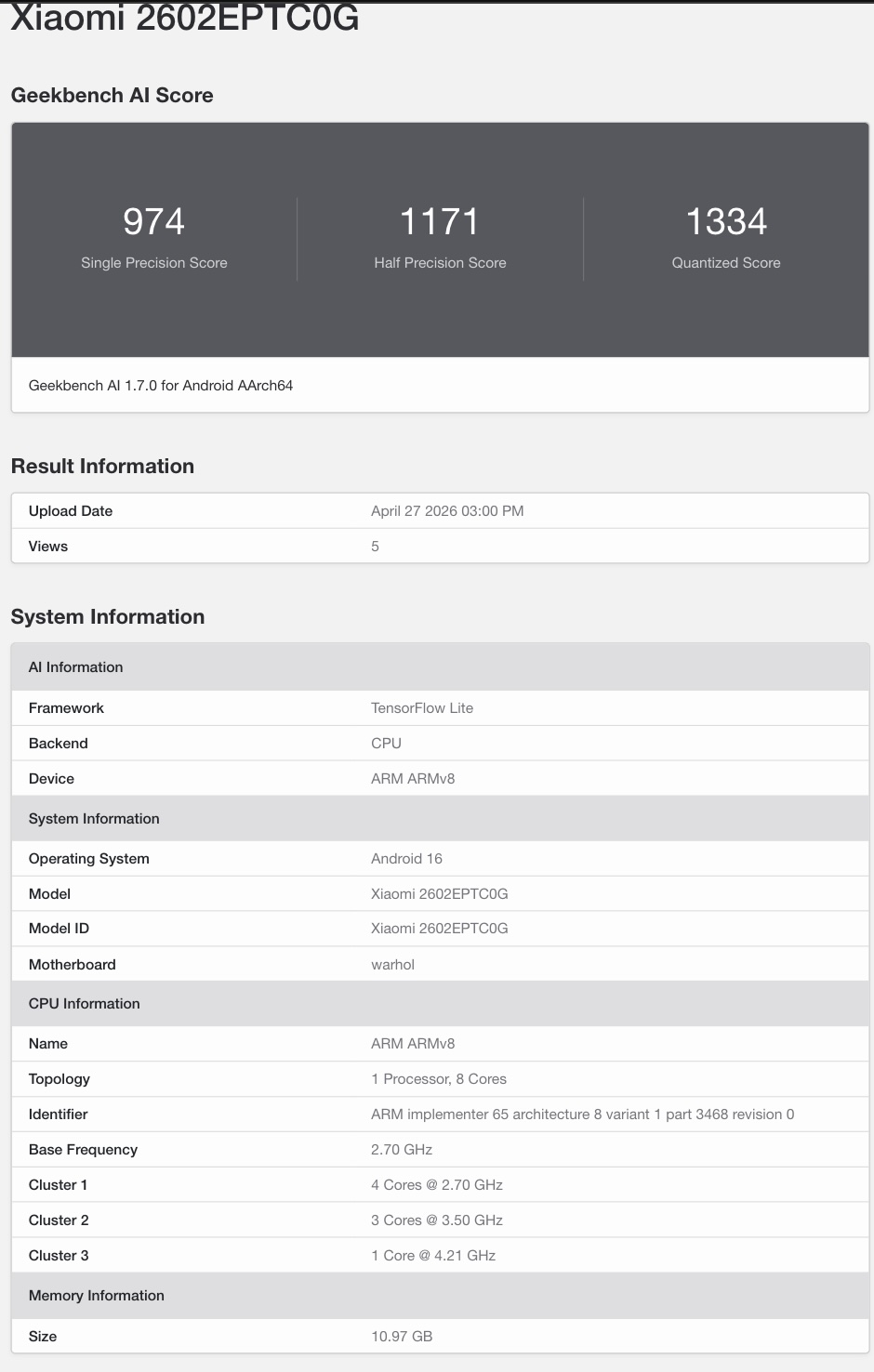 Recentemente, o padrão Xiaomi 17T apareceu no Geekbench. Agora, a variante global do Xiaomi 17T Pro com o número de modelo "2602EPTC0G" também apareceu no Geekbench AI. A listagem revela os detalhes do chipset do próximo smartphone de ponta.