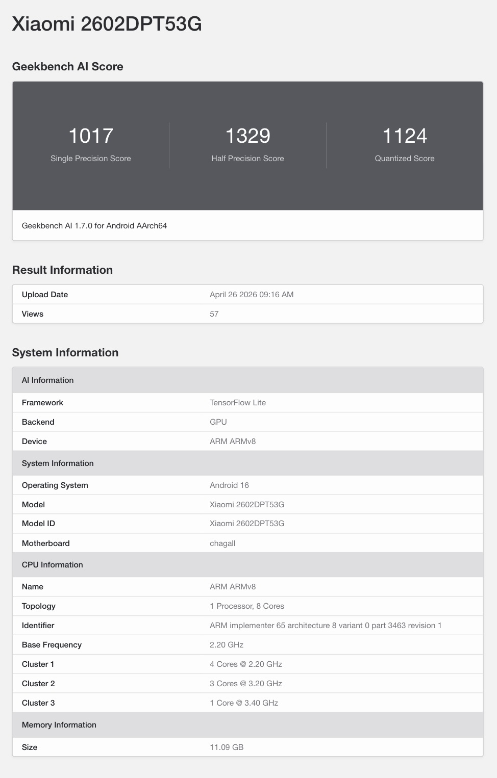 Um smartphone apareceu no site Geekbench com o número do modelo "2602DPT53G" Para referência, o mesmo número de modelo foi anteriormente já havia passado por várias certificações regulatórias e espera-se que pertença ao Xiaomi 17T padrão.
