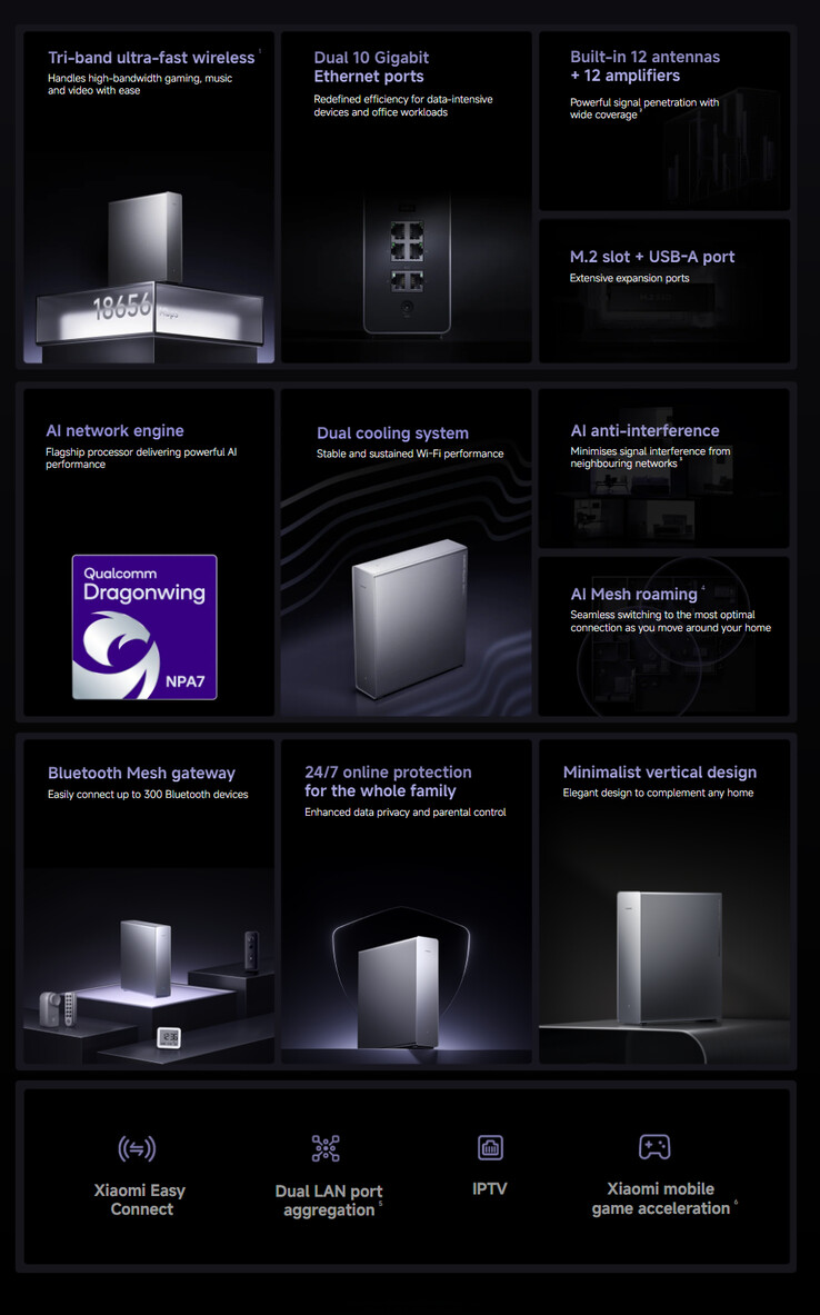 Além disso, a Xiaomi incluiu portas duplas de 10 Gigabit Ethernet e um slot M.2 2280 para que o Roteador BE19000 Pro funcione como um armazenamento conectado à rede (NAS). Como alternativa, a Xiaomi também incluiu uma porta USB 3.0 para compartilhar arquivos por meio de um pen drive. Mais detalhes podem ser encontrados em no site global da Xiaomi. No entanto, a empresa ainda não confirmou o preço ou a disponibilidade.