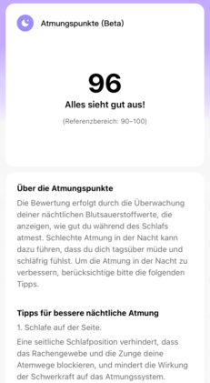 Para o teste, medimos a saturação simultaneamente em cada caso com um oxímetro de pulso medicamente certificado. Na série de medições, a Banda 6 estima consistentemente a saturação muito alta. Os desvios estão entre 1 e 4 pontos percentuais.