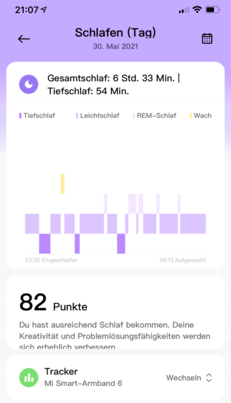 A Mi Band 6 não exibe nenhum dado sobre o sono em si. O registro do sono do aplicativo Xiaomi Wear Lite é comparativamente pobre. Ele não mostra a freqüência cardíaca, embora o aumento do monitoramento da freqüência cardíaca tenha sido habilitado especificamente para obter dados mais precisos sobre o sono.