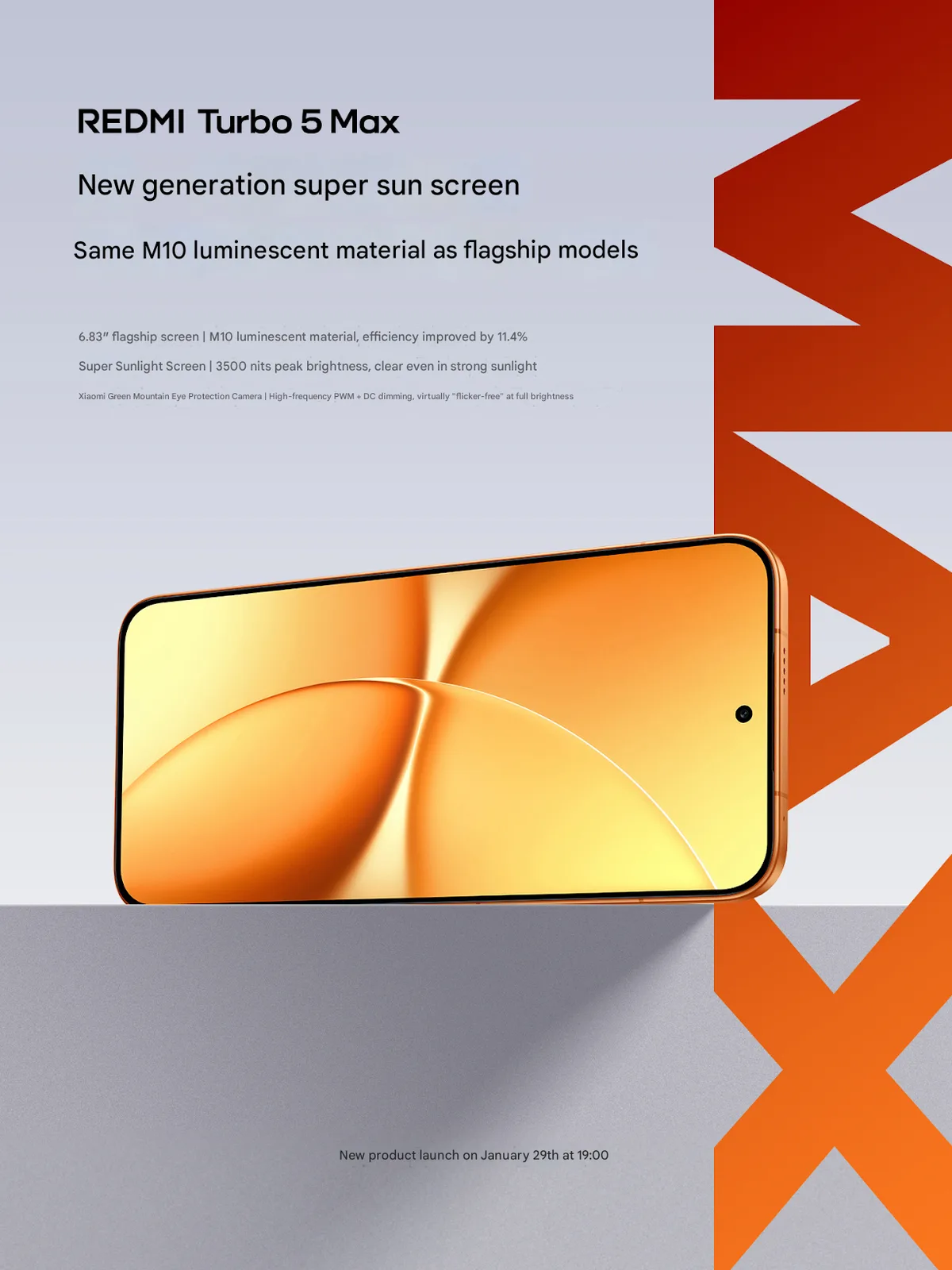 Sob a tela, há um sensor ultrassônico de impressão digital que promete oferecer uma experiência de desbloqueio rápida. A Xiaomi afirma que o posicionamento ideal melhora ainda mais os desbloqueios. Entre as outras informações recém-reveladas está a câmera principal do Redmi Turbo 5 Max, que tem a marca Light and Shadow Hunter 600.