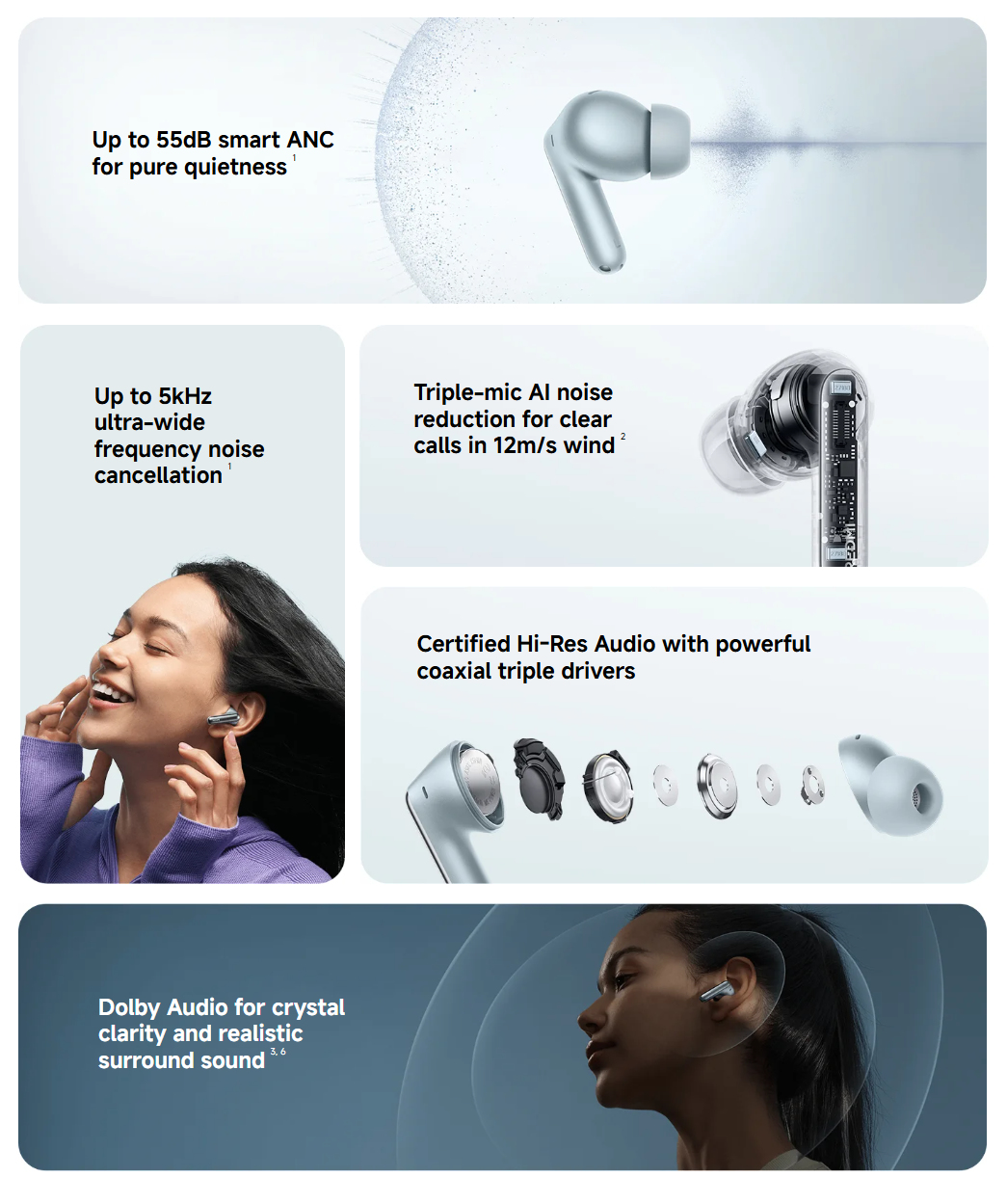 O Redmi Buds 8 Pro estará disponível globalmente nas cores Cloud White, Glacier Blue e Obsidian Black, todas com baterias de 54 mAh e 480 mAh dentro de seus estojos de carregamento correspondentes. Com até 8 horas de duração da bateria com uma única carga, a Xiaomi também instala um modem com capacidade para Bluetooth 5.4 e três microfones por fone de ouvido que ajudam a fornecer até 55 dB de cancelamento de ruído ativo (ANC).