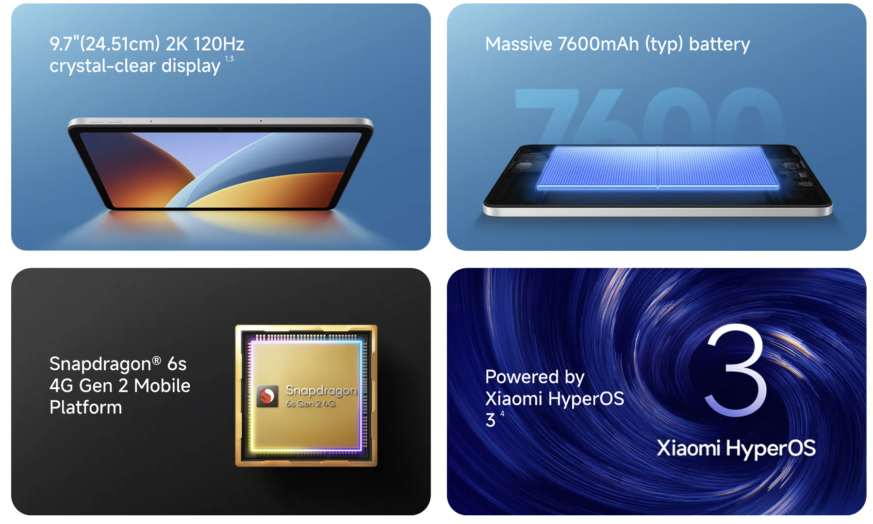 Pelo que podemos dizer, o Redmi Pad 2 9.7 carrega todo o hardware do Redmi Pad 2 SE existente. Por exemplo, a Xiaomi menciona um chipset Snapdragon 6s 4G Gen 2, bem como uma bateria de 7.600 mAh que suporta carregamento com fio de 18 W. O novo tablet também apresenta uma tela IPS de 120 Hz com resolução de 2.048 x 1.280 com proporção de 16:10 e brilho máximo de até 600 nits no modo externo.