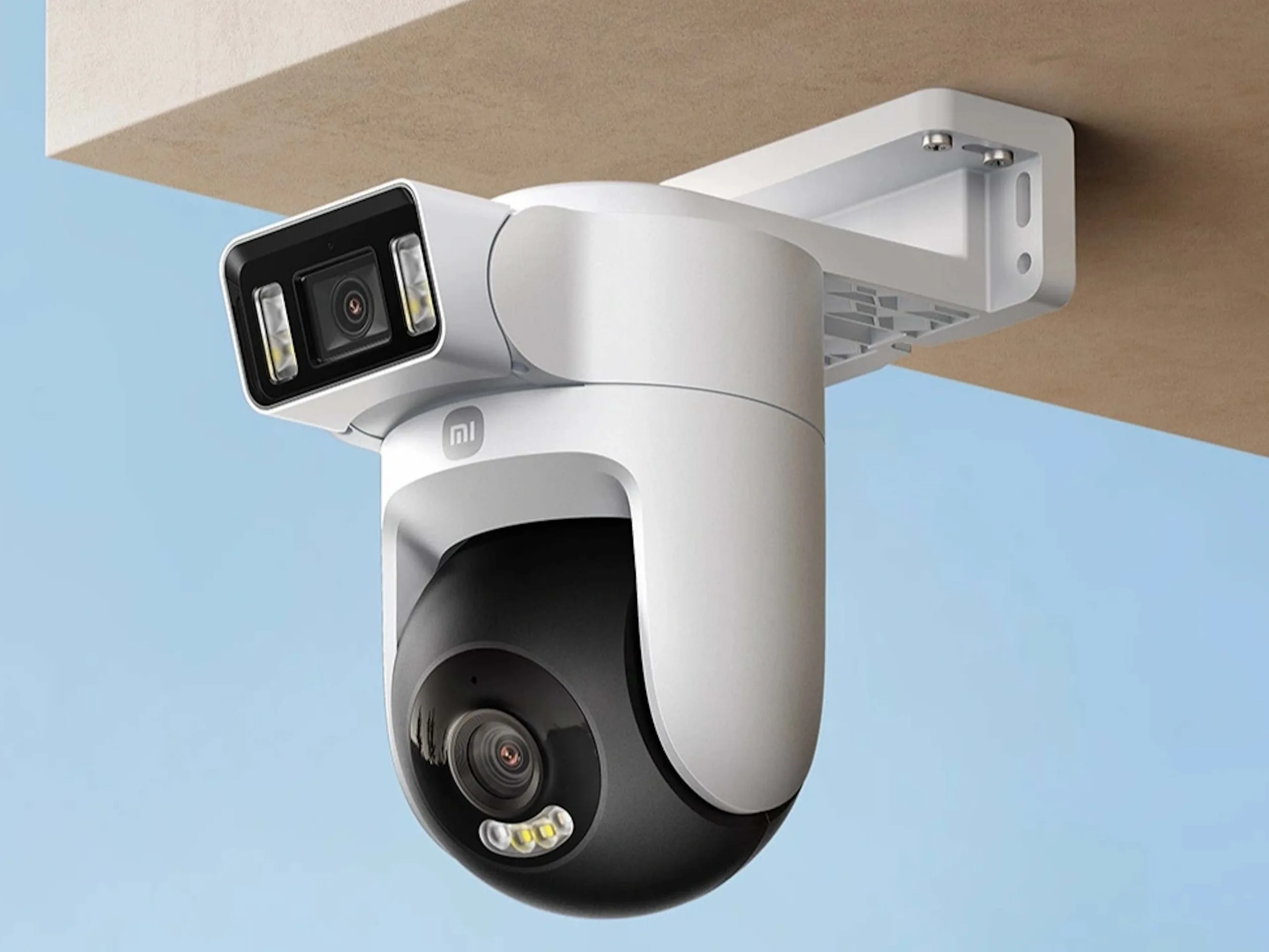 A nova Xiaomi Smart Outdoor Camera tem duas câmeras de 5 MP que capturam imagens com resolução de 3K (2.880 x 1.620 px). A lente superior é fixa no lugar, enquanto a inferior pode fazer pan, tilt e zoom, permitindo que o senhor observe duas áreas simultaneamente. Esse modelo oferece visão noturna totalmente colorida e pode usar IA para detectar humanos e veículos.