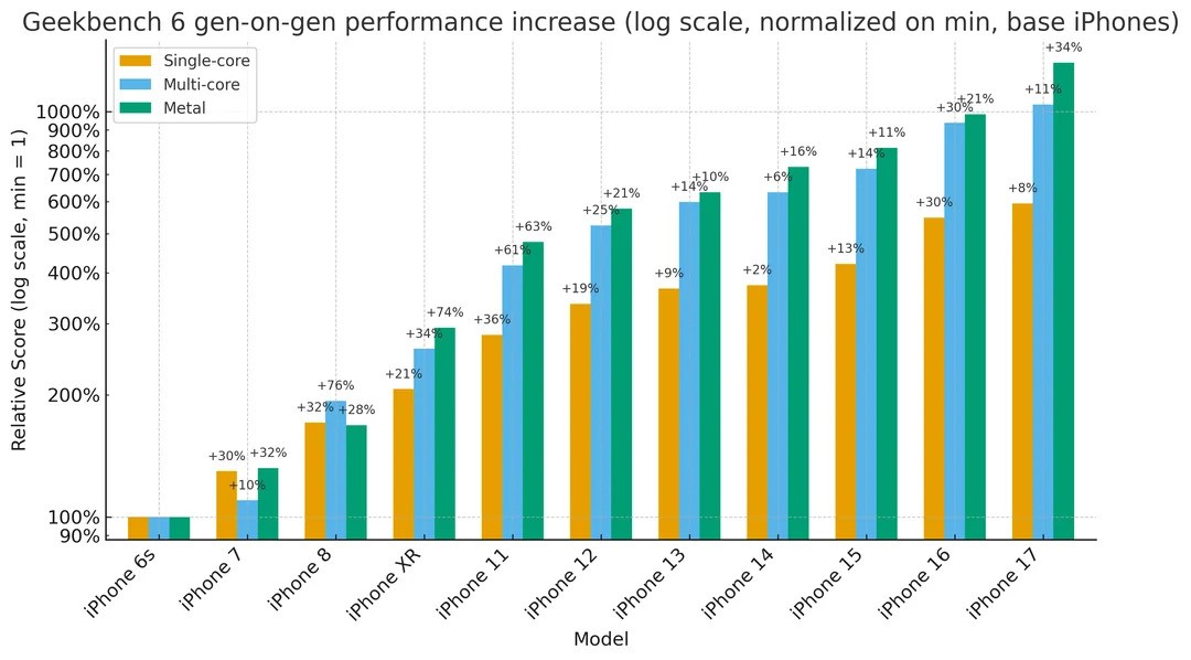 Aqui, é útil observar o quanto os smartphones evoluíram, pelo menos de uma perspectiva puramente de desempenho, para apreciar a potência que carregamos conosco todos os dias. Um usuário do no r/iPhone compilou vários gráficos mostrando as melhorias de desempenho de geração em geração para os modelos de iPhone, desde o iPhone 6S (2015) até o mais recente série iPhone 17.