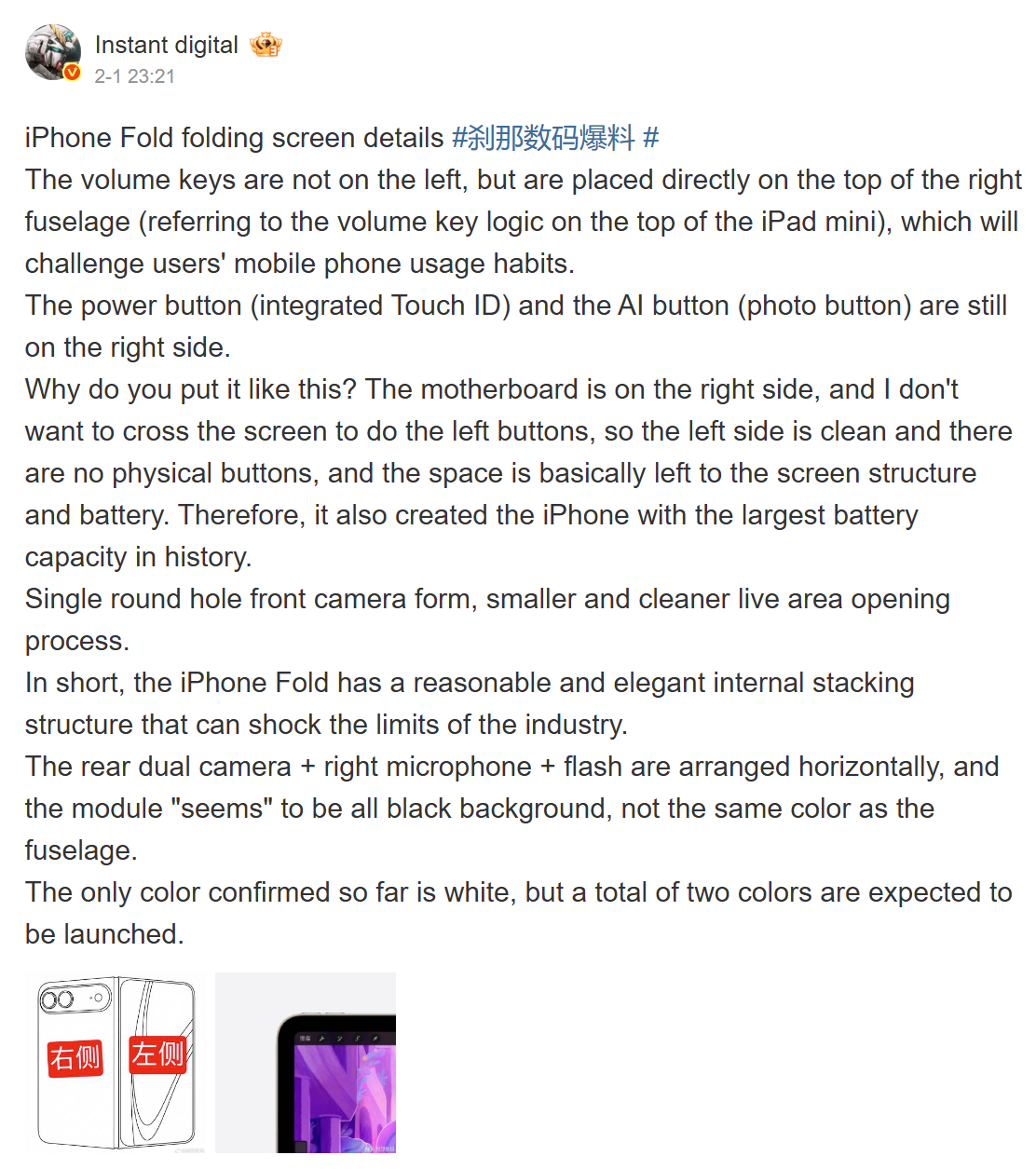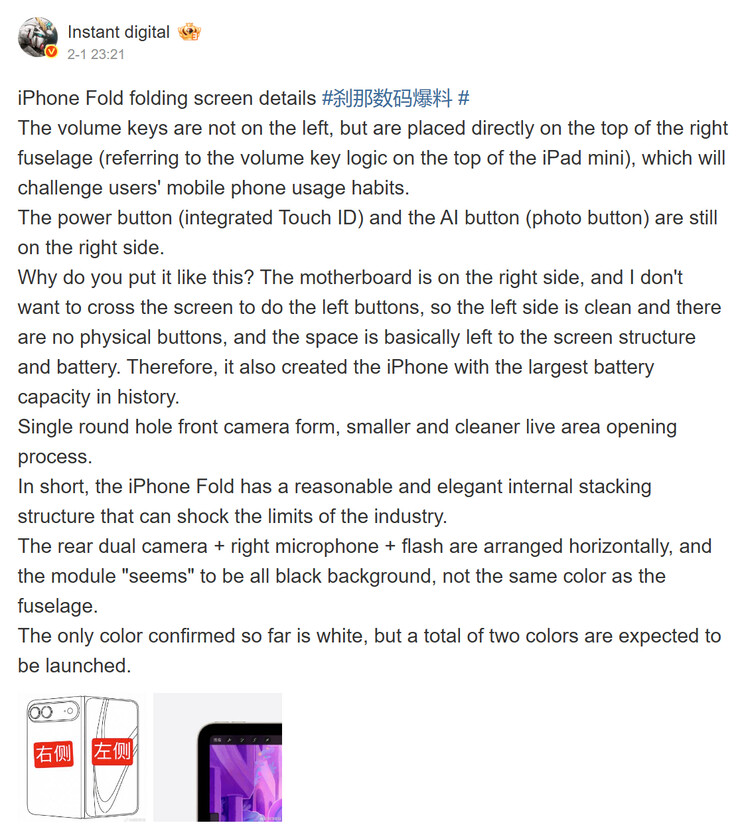 Aparentemente, o iPhone Fold imitará o iPad mini com todos os seus botões no lado direito, incluindo um botão de energia com Touch ID. Diz-se que uma placa lógica empilhada nessa metade também elimina a necessidade de excesso de fiação. Atualmente, espera-se que o Apple lance o iPhone Fold em duas opções de cores, embora apenas uma opção de cor branca com um módulo de câmera "totalmente preto" tenha sido confirmada até o momento.
