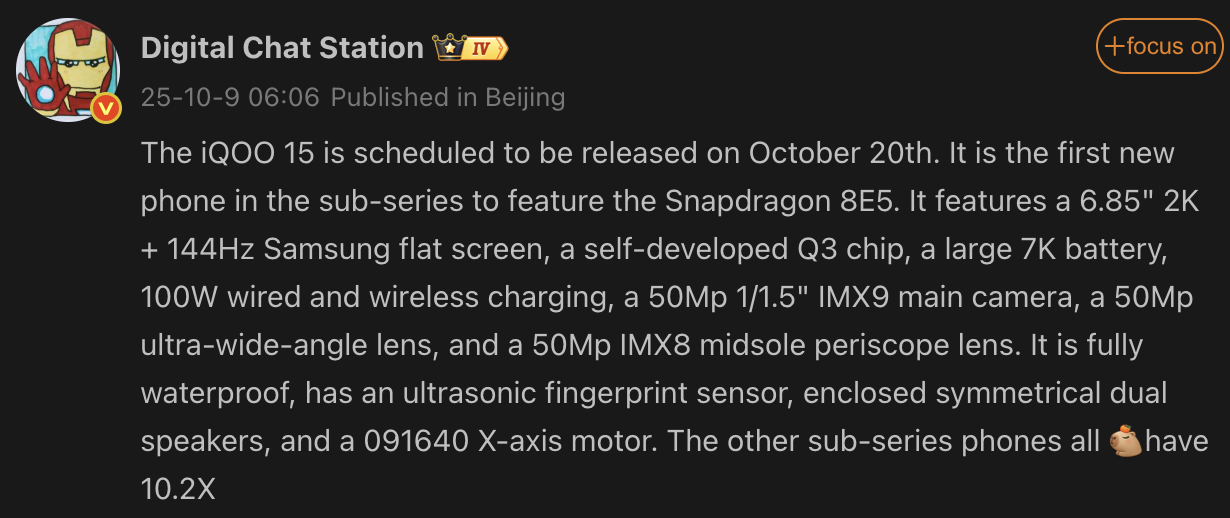 O iQoo 15 é o carro-chefe da próxima geração da empresa Android, sucedendo o iQoo 13 do ano passado iQoo 13. A empresa chinesa revelou anteriormente que o iQoo 15 será equipado com o mais recente Qualcomm Snapdragon 8 Elite Gen 5 da Qualcomm. Agora, a iQoo revelou a data de lançamento do telefone na China.