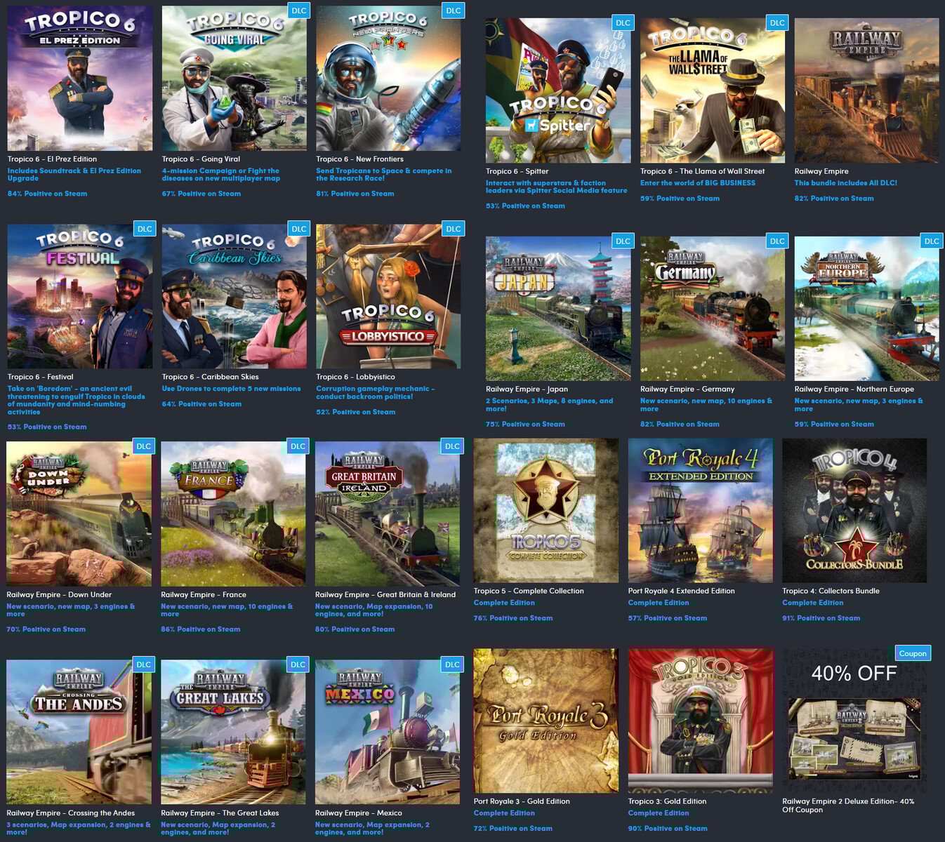 - Tropico 6 - El Prez Edition - no valor de US$ 44,99, inclui a trilha sonora e a atualização El Prez para o jogo base, e tem uma classificação positiva de 84% no Steam.