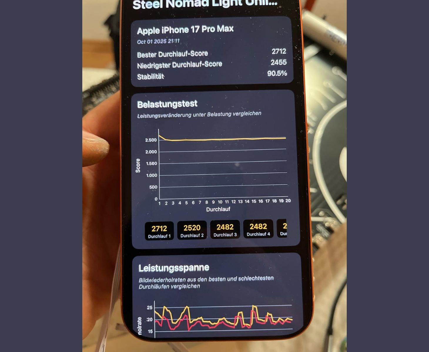 Recentemente, vimos como o sistema de resfriamento funciona no Apple iPhone 17 Pro Max durante a execução de jogos AAA, como Assassin's Creed Mirage e Resident Evil 4. O iPhone 17 Pro Max não só consegue rodar esses jogos a 60 FPS, como também o faz sem aceleração térmica. Mesmo em benchmarks de GPU, como o teste de estresse 3DMark Solar Bay, o iPhone 17 Pro Max teve um bom desempenhoespecialmente considerando que agora ele tem o novo e mais potente chip A19. Para um dispositivo de computação móvel sem nenhum resfriamento ativo, como um ventilador, a série iPhone 17 parece uma atualização genuína em relação à série iPhone 16.