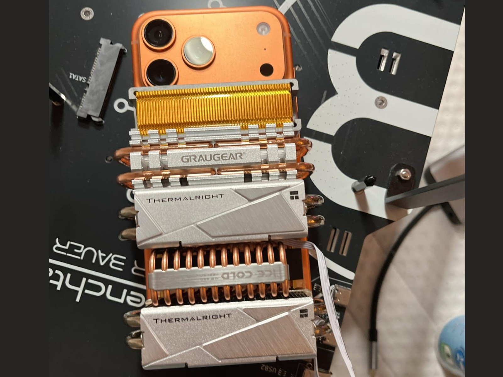 As fotos na postagem do Reddit intitulada "17 Pro Max Cooling with M2 SSD Cooler 90% Stability in 3D Mark Stress Test" mostram uma configuração de resfriamento DIY em que dissipadores de calor e coolers de tubo de calor para desktop, normalmente usados para SSDs, são montados no iPhone 17 Pro Max para reduzir a aceleração térmica durante jogos pesados ou benchmarks.